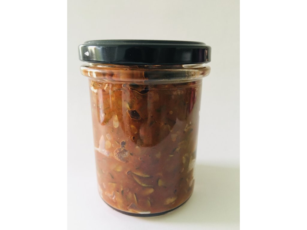 Složení: Cuketa, cibule, rajčatový protlak, olej, česnek, sůl, cukr, vinný ocet, worcestrová omáčka, chilli.